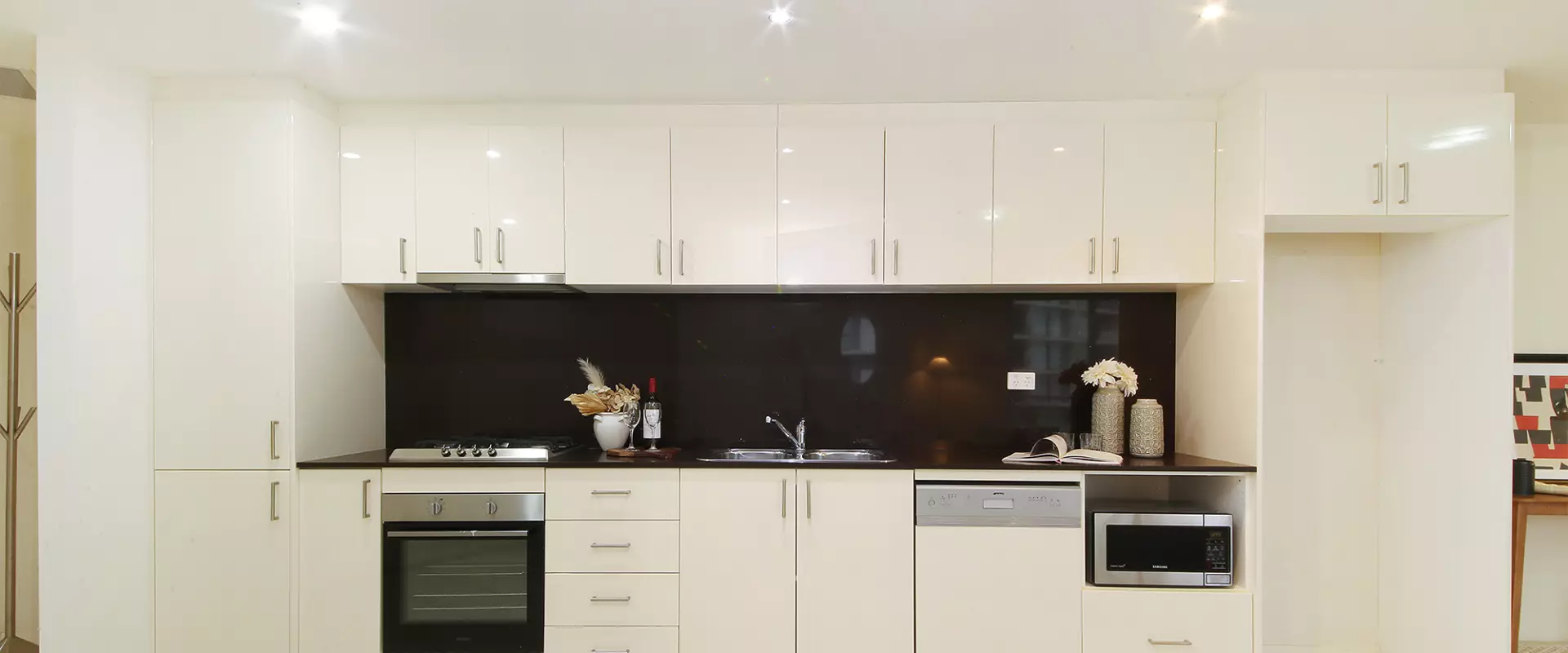 Sleek gas kitchen with Caesar stone Bench Tops and Smeg Appliances