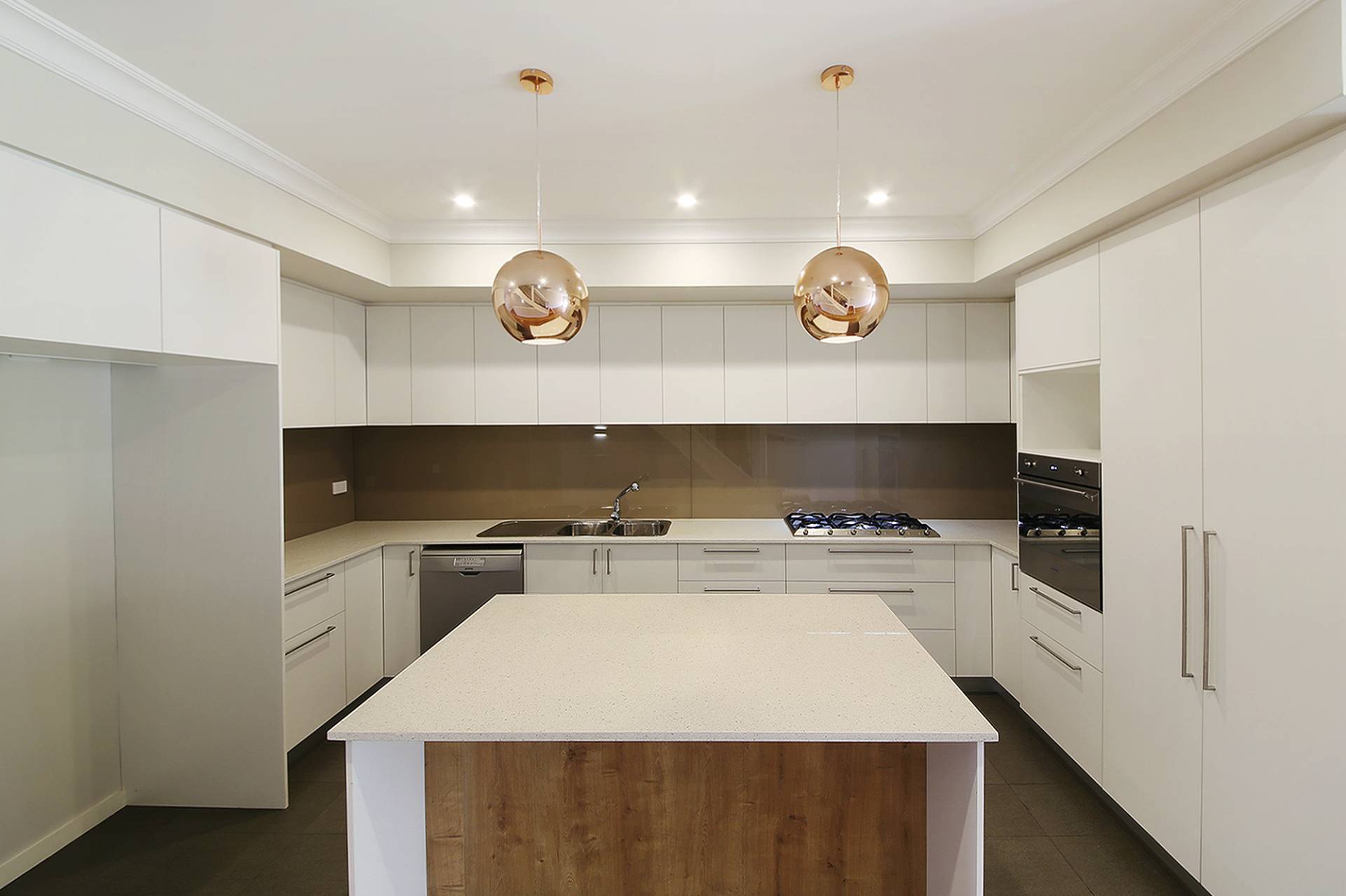 - Sleek gas kitchen with integrated SMEG appliances, caesarstone benchtop and glass splash-back