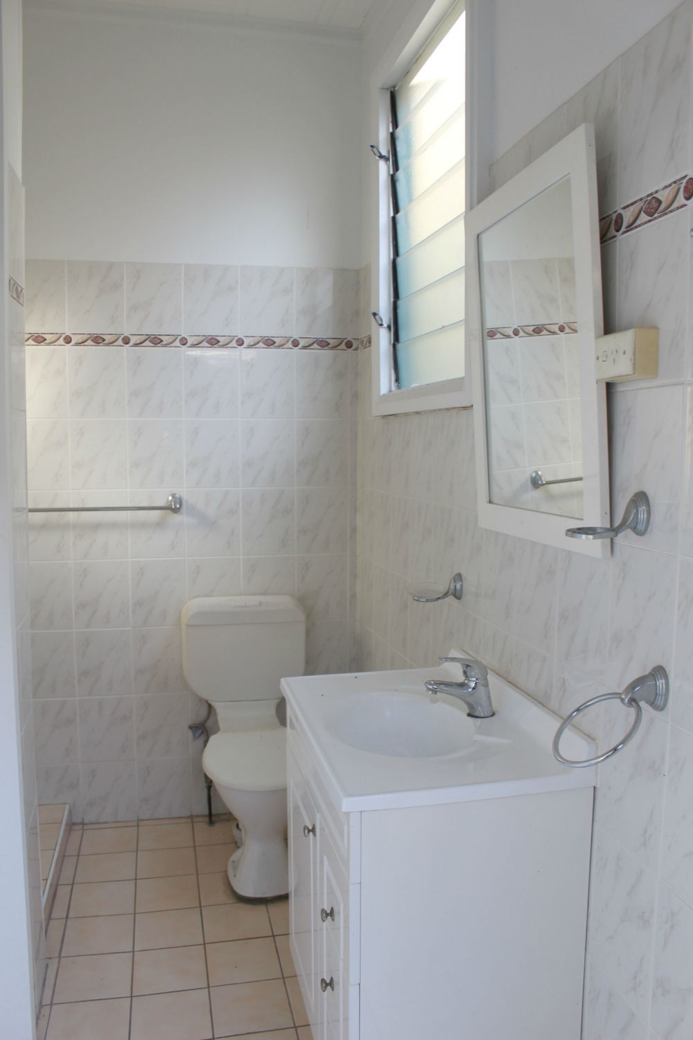 Fully tiled bathroom, separate laundry area with washing machine