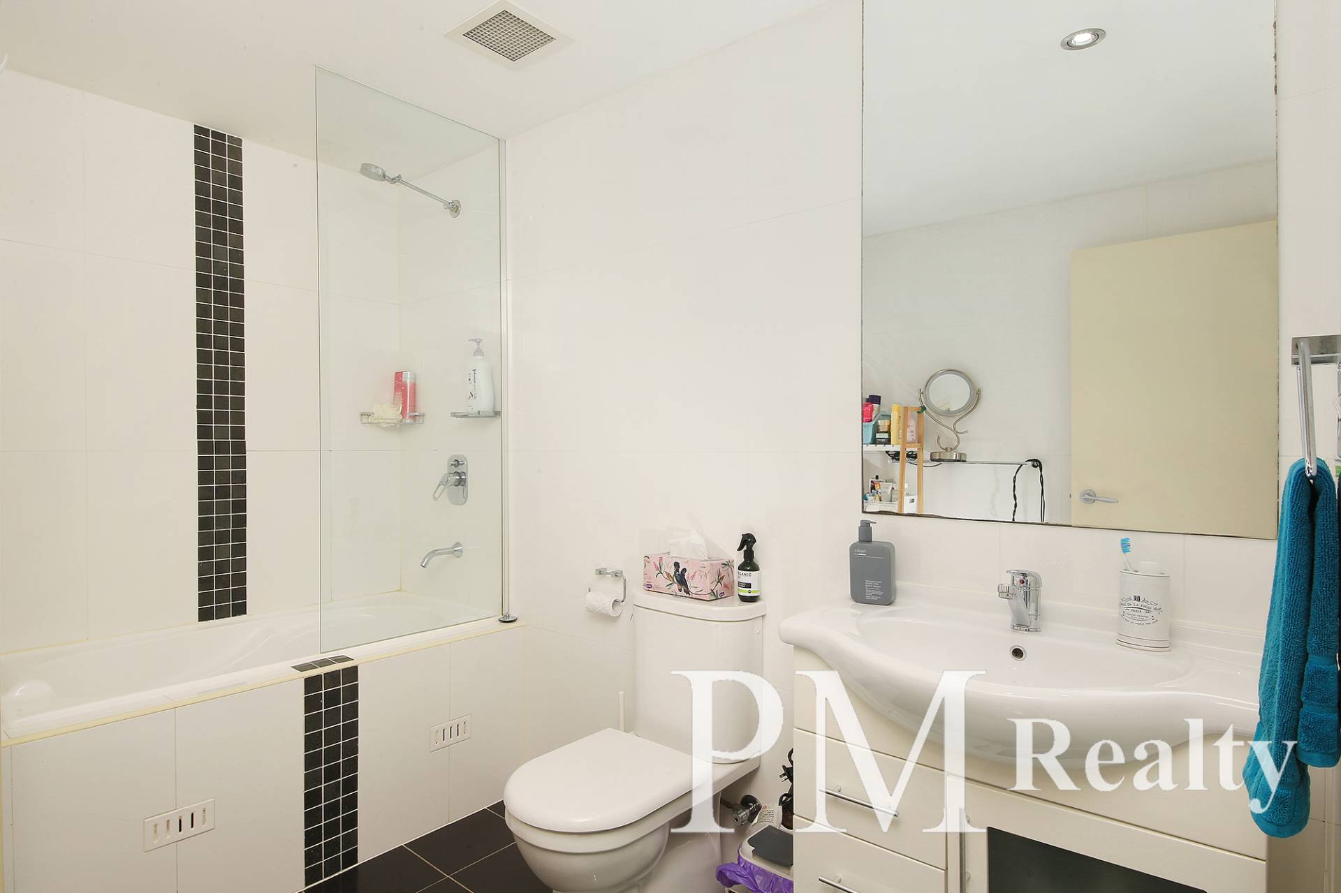 - Well-appointed bathroom fitted with floor-to-ceiling tiles