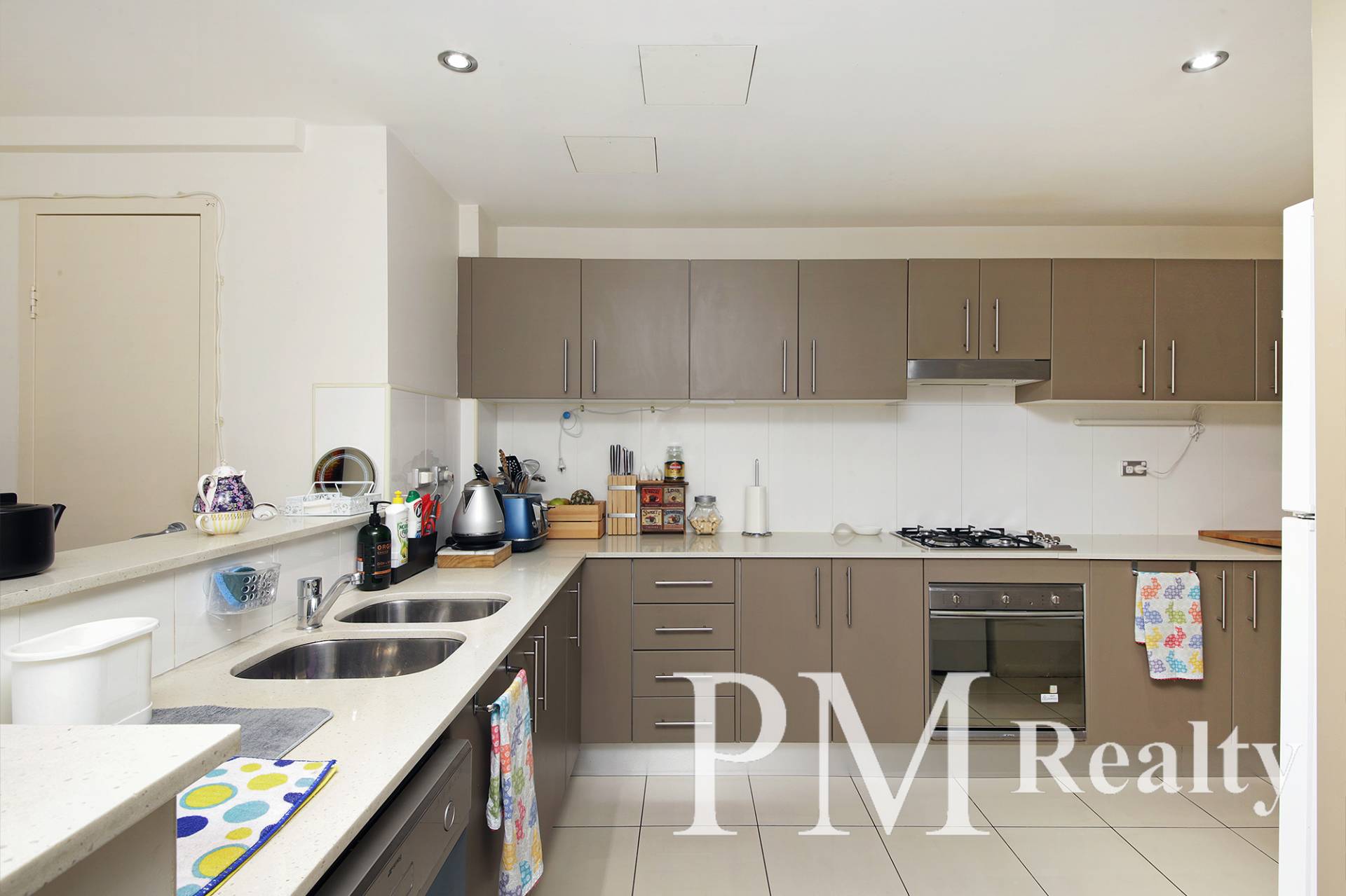 - Modern kitchen features stone benchtops and sleek gas cooktop